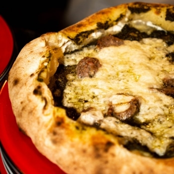 El icónico borde alveolado nace del equilibrio entre la hidratación de la masa, el estirado manual y la cocción rápida. Ligero, aireado y lleno de sabor: el sello más reconocible de Nápoles.