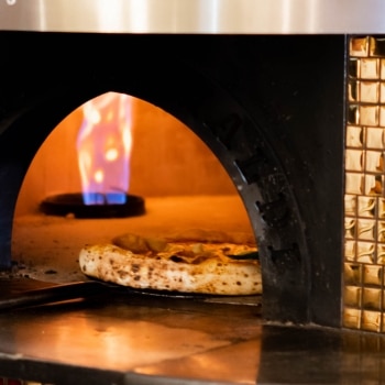 La pizza se hornea entre 60 y 90 segundos en un horno de piedra refractaria tradicional. Esta cocción exprés crea una base tierna en el centro, bordes inflados y un tostado perfecto.